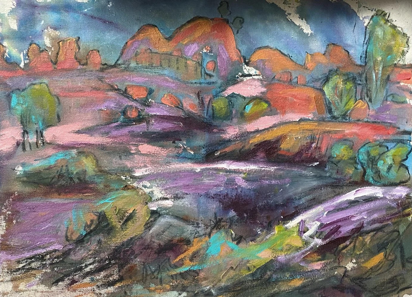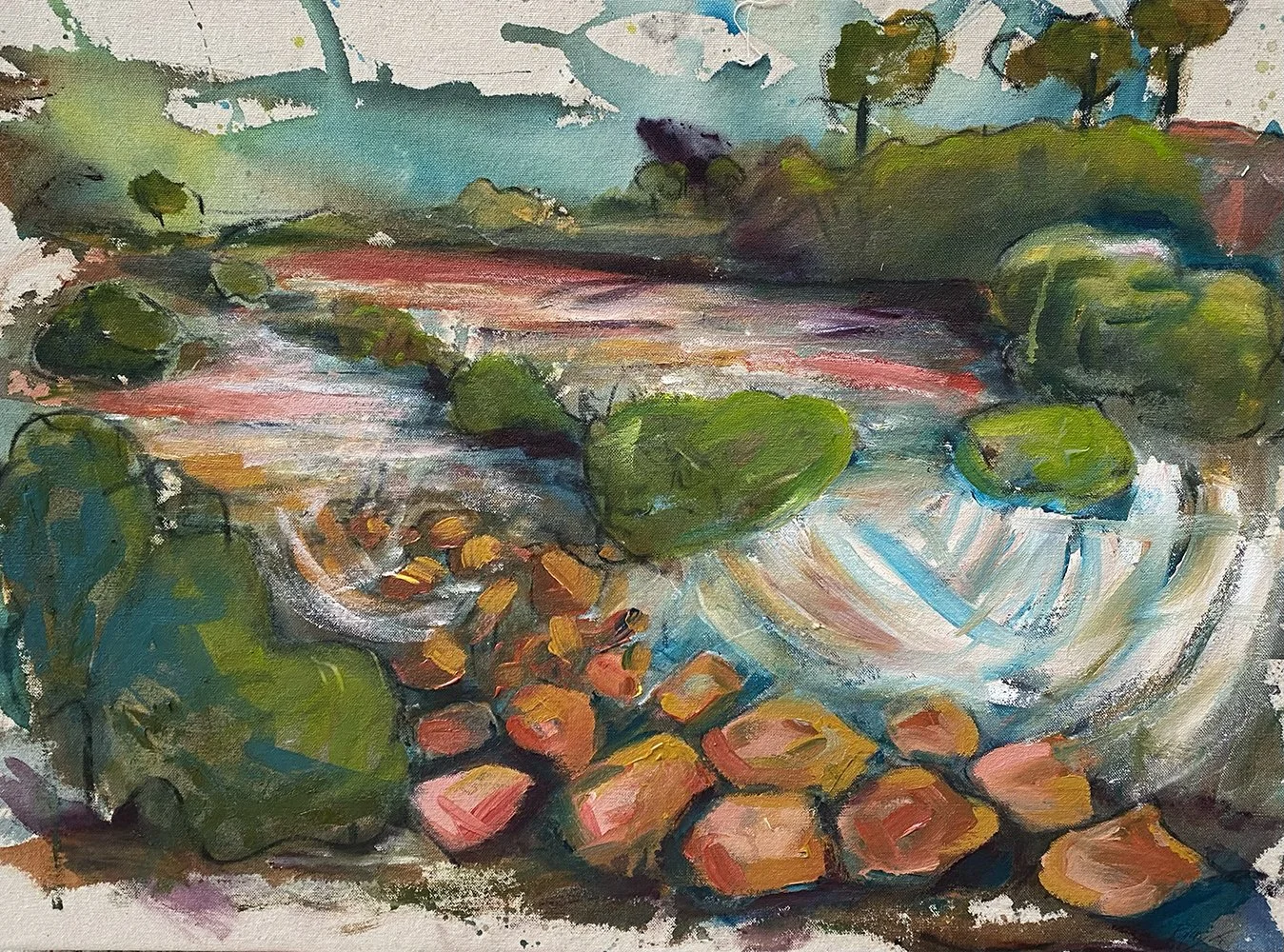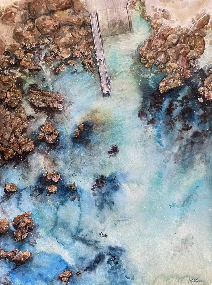 Her work uses watercolour, acrylic paint and inks to create vibrant flowing landscapes and aerial seascapes.