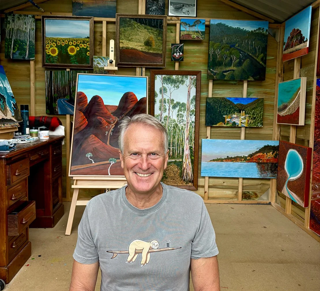 Working primarily with acrylic paint, Glenn paints in a realistic style, focusing on the atmosphere and colour of the natural world. His subjects are drawn from the coastal environment, the textures and tones of the Australian bush, and the rich red landscapes of the outback. Through careful observation and layering of colour, Glenn aims to capture the essence, light, and character of these uniquely Australian scenes.